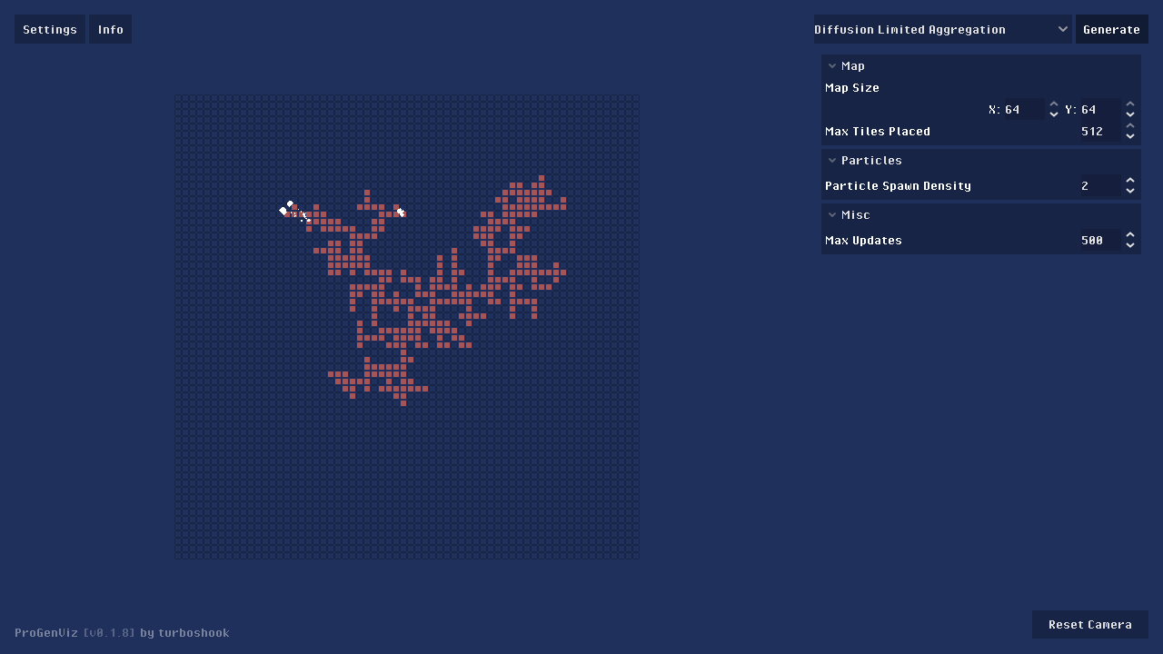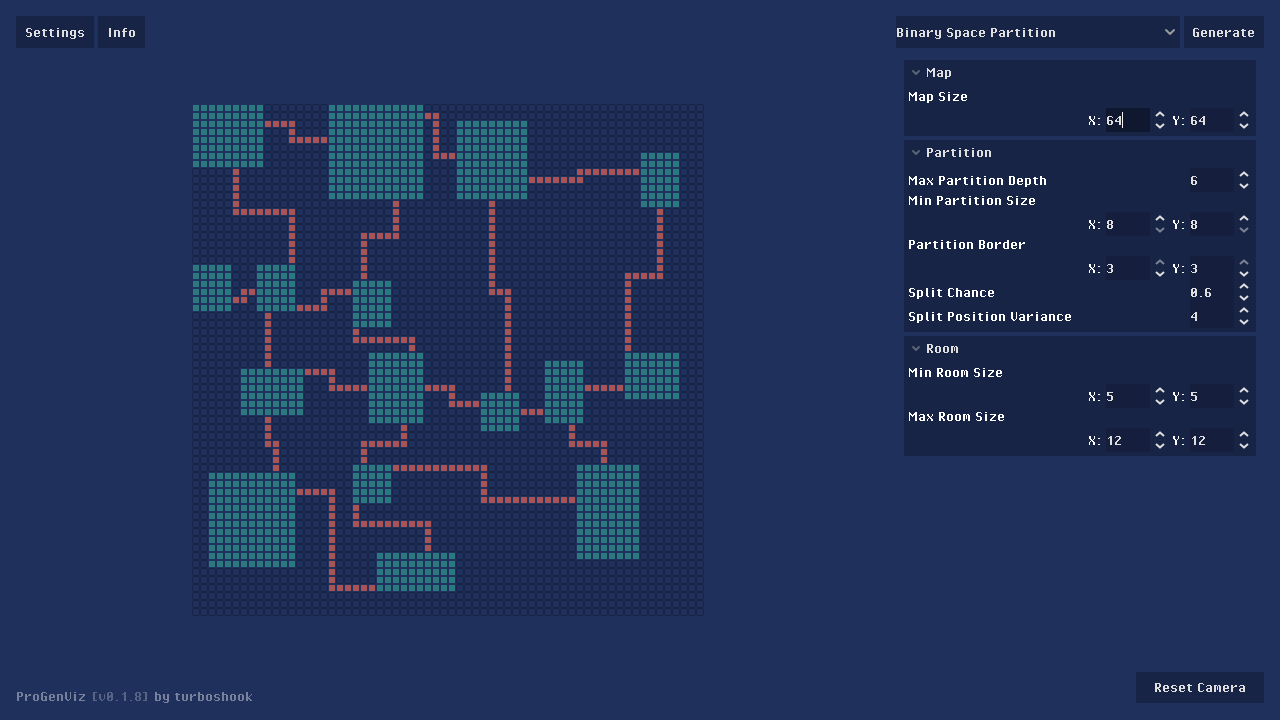 ProGenViz is a simple interface for tinkering with various procedural generation implementations. This project is intended to serve as an exercise and portfolio item for myself as well as an educational tool for other Godot developers who are interested in implementing procedural generation in their own projects.